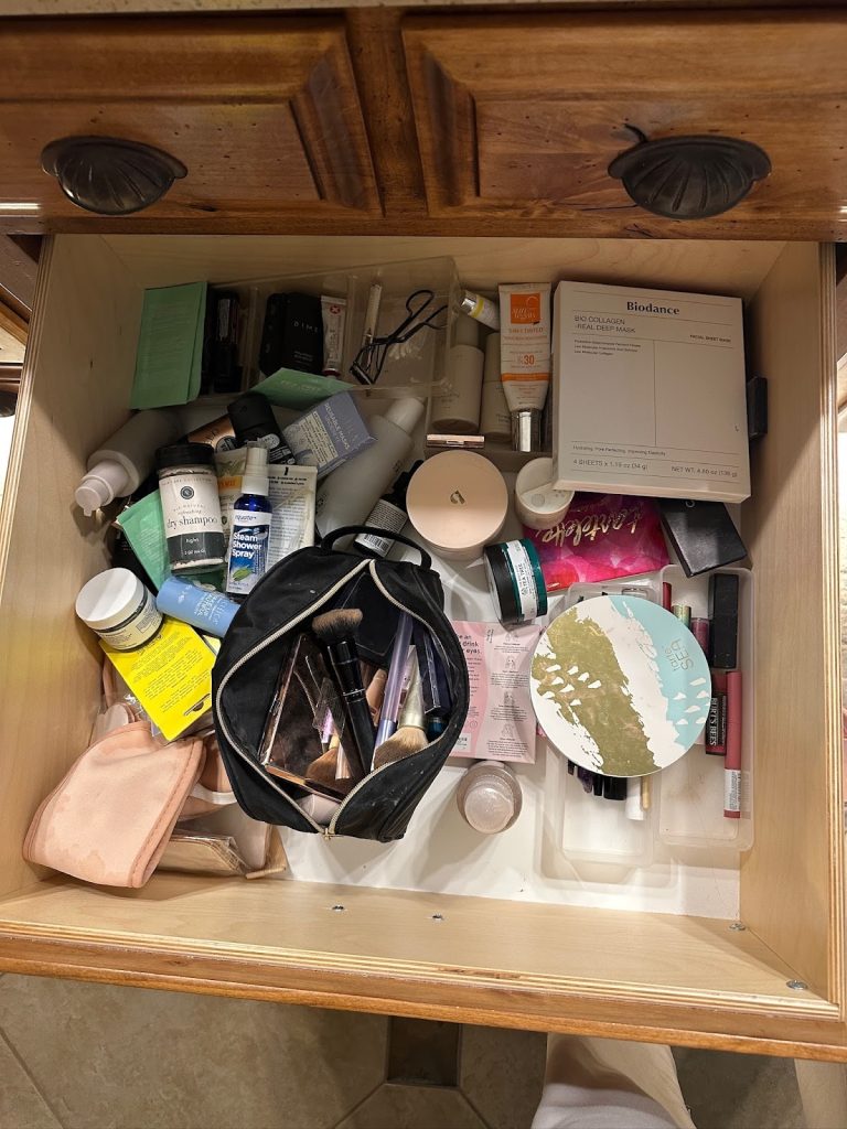 Before organizing: travel items and toiletries quickly pile up when there isn’t a clear system in place.