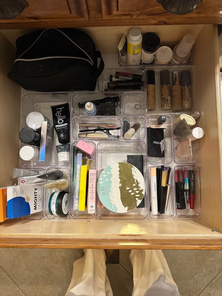 In the organized drawer shown above, clear containers make the reset process simple. When you come home from a trip, you just place each item back into its section and the drawer stays calm and functional.