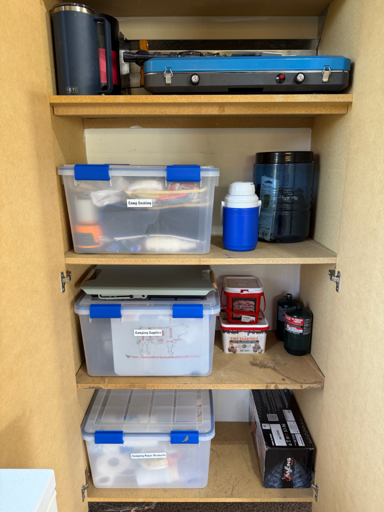 Labeled bins keep travel and camping gear contained and easy to find for the next trip.